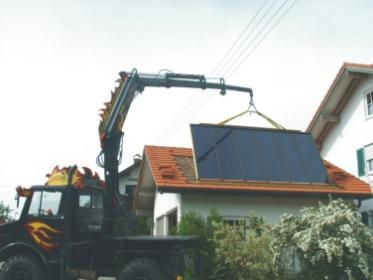 Wie der Flachkollektor überzeugt auch der Großflächenkollektor mit hohe Fertigungsqualität. Durch das Vollholzgehäuse können die Großflächenkollektoren ausschließlich als Indachversion eingesetzt werden. Die Riesen werden mit einem Autokran auf das Hausdach gelegt und zwischen den Dachplatten integriert.